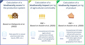 Finally, the biodiversity impact of a product composed of several raw materials (Figure 2, step 3) considers the scores of all the ingredients that compose it, weighted according to their presence in the product.