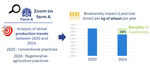 Furthermore, biodiversity is a matter of time! It is therefore interesting to determine trajectories and estimate the benefits of practices adopted over time for biodiversity (Figure 4). For example, four years of regenerative practices on soils and landscapes enable Farm A to achieve a 22% benefit for biodiversity.